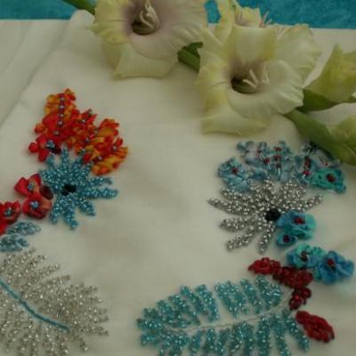 Matières : crêpe de soie - -- fils de soie- rubans de soie